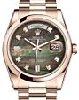 - Rolex Day-Date 36 Rose Gold Black Mother of Pearl Diamond Dial & Smooth Domed Bezel President Bracelet 118205 Rolex Day-Date 36 Rose Gold Black ... Domed Bezel President Bracelet 118205Retail Price: Regular Price $38,750 Save: $7,151 (18%) Our Price: Special Price $31,599