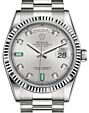 - Rolex Day-Date 36 White Gold Rhodium Diamond & Emeralds Dial & Fluted Bezel President Bracelet 118239 Rolex Day-Date 36 White Gold Rhodium ... Fluted Bezel President Bracelet 118239Retail Price: Regular Price $40,500 Save: $7,401 (18%) Our Price: Special Price $33,099