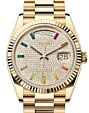 - Rolex Day-Date 36 President Yellow Gold Rainbow Colored Sapphires Dial Fluted Bezel Diamond Bracelet 128238 Rolex Day-Date 36 President Yellow Gold ... Fluted Bezel Diamond Bracelet 128238Retail Price: Regular Price $124,500 Save: $1 (0%) Our Price: Special Price $124,499