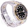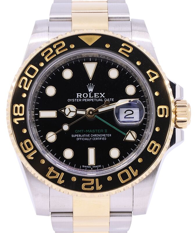 Hey guys, this is Kevin from JazTime.com and today we'll be reviewing the Rolex GMT-Master II, model number 116713. We'll be going over the price, the dial, the bezel, case, crown, bracelet, clasp and we'll talk about the movement towards the end of the video. Okay, so as of June 2018, you can get this watch from an authorized Rolex retailer for $13 000, plus tax, or here at JazTime.com, we always strive to have the most up-to-date pricing, so give our website a thorough look-through before you make your purchase decision. All right, so let's go ahead and move on to the dial now. So the dial is a standard sports-style dial as for Rolex, such as like the Submariner, Deep Sea and Sea Dweller and such. We have the maxi dial, which are these large, circular hour markers and index six and nine markers, with a triangular 12 o'clock hour marker. They're all fashioned in 18-carat yellow gold to prevent any tarnishing, and they're all luminous-filled with a highly legible chromalight display. We have the date window at the three o'clock position, with a Cyclops lens on top of that sapphire crystal for magnification, easier viewing of that date. Of course, the hour hand, for being a sports watch, is a Mercedes hand, luminous filled as well. Minute hand, nice and bold, so easy to read. Additionally because the hour markers and the hands are all luminous filled, this watch is easy, easy to read in the dark as it does glow in the dark. Additionally, because this is a GMT, we have a additional hand right in the center here, the GMT hand pointing at the 12 o'clock position currently, that is highlighted by a green portion of the stick, and also a triangular tip, also fashioned in 18-carat yellow gold. That GMT hand helps with the tracking of additional time zone, and I'll show you how that works later on, when we move on to the crown. But besides that, very standard Rolex-style sports dial. Moving on to the bezel now, the bezel is a bi-directional, rotatable, 24-hour graduated Cerachrom insert in ceramic. Cerachrom being Rolex's term for a ceramic bezel. The use of the bezel being bi-directional allows for the tracking of an additional time zone, for specifically GMT-Master II, you can track up to three time zones by adjusting the bezel. Moving on to the case now, the case we're looking at a 40 millimeter case, the standard size for Rolex sports pieces. So index finger to my thumb here, that's 40 millimeters in diameter, nice sand finish on the lugs of the case. For the side profile, we're looking at a slightly thicker than normal watch, as it is a GMT watch, it does have extra complications in the movement to allow for the extra hour hand for the tracking of a second time zone, so the extra complication will add a little bit more thickness to the movement, which in turn adds a little more thickness to the profile of the watch. However, nice high polish on the side of the case, that patterns very nicely with the bracelet. As you can see from the crown protectors on the other side as well, nicely high polished throughout. Rolex crown logo on the crown itself, the crown being made out of 18-carat yellow gold, as you can see as it stands out from between the two highly-polished steel crown protectors. Okay, so for the crown functions, we're looking at a screw-down Triplock, triple waterproofness system. So it unwinds, counter-clockwise as shown. In its standard position, this is where you can wind the watch up to fifteen to twenty clockwise turns, that's all you need, as shown. And I'll get the watch started once again. Simply tugging out the crown to the next position, with a light tug, we'll switch to the next function of the crown, which is a quick hour jump system. Unfortunately, unlike the other sports pieces, such as Submariner, there is no quick-set date, where you can just immediately change the date, just by turning the crown clockwise. Instead, you'll have to two revolutions, of course that's meaning of a 24-hour period of the hour hand, in order to change the date. So once again, one, and two. Shift that back for you to see again, so one, and two. And the purpose of the GMT having that function, of being able to just move the hour hand independently of the minute hand, is to allow for a quick adjustment to the time zones. So let's just say, once again, if you wanted to track your home time, let's say London time is currently at 10:10 at the moment. You're taking a business trip to the Philippines, then you can just go into the final position of the crown, as you tug out the crown into the final position, and just switch over that GMT hand to that 10 o'clock position again. There we are, there's that 10:10 position. Switch back to that hour hand and just shift it seven hours ahead, so 1, 2, 3, 4, 5, 6, and 7. There we are, so now you have your home time being with the GMT hand, and the current time zone in the Philippines being seven hours ahead of that 10, so five a.m. and there you are, that's how you can track the two times zones and you can use the bezel, using the very top indent of the bezel to track the third time zone from there. One thing I want to mention, at the final position of the crown, it will stop the second hand of the hack movement, let it tick over here. So, pulling it out, there we are. You can see the second hand is currently stopped, and then you can adjust the time however you like. Pressing the crown back in will start that second hand once more, and always make sure, screw the crown nice and tight against the case, because you want to keep the watch water-resistant for its 100 meters or 330 feet, specifically for the GMT-Master II. Okay, moving on, so little bit different thing about the GMT-Master II compared to most sports pieces is that for the bracelet we have the sports bracelet, which is an Oyster bracelet. Nicely sand-finished on the sides of the outer of the three-piece links, but however down the center we have this nice high-polish on the yellow gold that goes