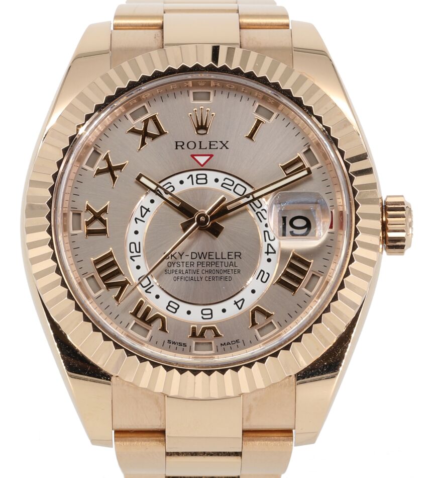 Welcome to Jaztime. JazTime.com is an online store that buys, sells, trades, authentic luxury watches. We make these videos so our customers can easily choose the best watch for themselves in the comfort of their own home. If you would like to know the price, simply click on the link in the description below. If you enjoy our videos, we greatly appreciate it if you would buy a watch at JazTime.com. Today I'm going to be reviewing the Rolex Sky-Dweller in rose gold, reference 3 2 6 9 3 5 with a pink roman dial and oyster bracelet. I'm going to talk to you guys about the case, the dial, the bezel, the bracelet, the movement, try it on, and give you my thoughts. So let's dive right in. The case is an oyster case and it's 42 millimeters, it's everose gold, also known as rose gold. That means from my thumb to my index fingers, now Rolex makes their datejust and the largest size is 40 millimeter. And this one is 42. So it's the largest Rolex that datejust style watch that Rolex makes in this 42 millimeter. It's probably because its movement is so large and we'll get to that in just a moment. Okay. Now the case is rose gold. And how do I know that is that if you look at the back, the hallmarks here where my fingers are pointing, I actually had a loop earlier and I looped it before we bought this watch just to look at the hallmarks and they're really, really nice. You guys can't see it from the video but maybe you'll be able to see it in the pictures on our website, JazTime.com. I'm going to point to them again here. They're on the edge, each edge of these lugs. They're really nice. Okay. And that tells you that this is the rose gold watch. Okay. Now let's move on to the bezel. The bezel is a fluted bezel and in this one, this bezel is quite interesting because it's a fluted bi-directional rotatable, Rolex ring command bezel. Okay. Now I can't go into how to use it in this video because we have other videos on our YouTube channel that show you how to use it, but basically the bezel can turn and that allows you to set the time using this command bezel. It's actually a really ingenious idea by Rolex to use the bezel because you wonder how do you set the month? Well, you actually set it using this bezel. So it's pretty cool. You can watch our other videos on how to do that if you want. But anyways, the bezel itself is in 18 carat rose gold, also known as everett rose gold, all right. And that's 42 millimeter. So let's talk about the dial here. Now, this watch is special because this dial is like a datejust, but it has much more functions than a datejust. In fact, it can tell you not only a second time zone, which is this inner circle right here, it's a 24 hour disc and it goes around once every 24 hours that can tell you a second time zone. Like for example Asia, if you're in America and then it can also, it's also a calendar, not a perpetual calendar, but a calendar because you see this little red dot that signifies April, each of these 12 signifies one month. And this date that you see right there is kind of hidden by the hand, but that it says 31 right there if you can see it. That tells you the actual date. So it can tell you the month and the date. Yeah. Yeah. So that's pretty cool too. And this one is in pink roman, because hour markers are in roman. Now they actually don't make this dial anymore. They have replaced it with a rhodium index and or a white index. Now I actually think this one is really cool. I like it with this roman. I think it looks more dressy. I can only, and if you want this particular dial, you have to get this watch. It's actually discontinued. But at JazTime.com, we could probably still get it for you. If we can't get you this one we'd probably get you one very similar. Now I really like it. I think it makes it much more classy looking then the index. But I can say one little zonk against this dial is that it's hard to read at night. And here's what I mean by that, when I shine the UV light on it, this is what it looks like at night. It's like, it only shows the hour and the minute it's like, you can't really see the hour markers it's like, come on Rolex. How can you not like put some hour markers here? They could have put like some luminescent at each 12 hour marker or each hour marker that would have been maybe easier to read at night. That's kind of a zonk. But then again, it's like how many people are really, you know, need to look at this thing at night. And you know what? Some people don't even look at their watch for the time. So I guess, you know, but anyways that's just one small thing. But yeah, this is a really cool dial. So let's move on to the movement here. Now the movement is housed in the case, it doesn't have an exhibition case back so you can't see it, but it's a caliber 9 0 0 1. It's super complicated. It has a precision of plus minus two seconds a day and has a power reserve of 72 hours. I mean, I can't really go too much into detail. I mean, and you can't see the movement anyways. Suffice it to say it's a really awesome movement. The bracelet now is a oyster bracelet. It's a flat three piece link and it's 18 carat everose. They also call it rose gold or whatever you'd like to, rose gold, everose, pink gold. Any of those. Now it has a folding oyster clasp with easy five millimeter comfort extension. Now it doesn't have a safety clasp, that just means you fold it over once like that and click it. Now you could see why this is not a sports watch because this motion could easily come undone. And for a sports watch you don't want that. But this is actually a dress watch. So that doesn't matter. Okay so I told you I would go through all those things and I have. Now it's time for me to try it on. Now, this was actually one of my favorite watches. I guess, if you can call almost $40,000 watch favorite, this would be it. Now, why do I like it? Well, I think it looks very dressy. I love rose gold myself, because I think it looks like gold. It is gold, but it 