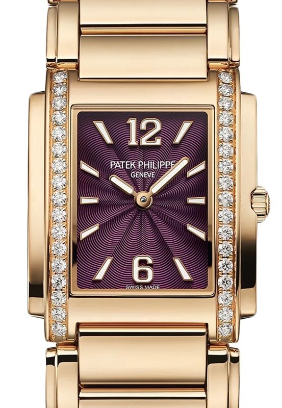 This certified authentic Brand New Patek Philippe Twenty~4 Watch, with the Model Number: 4910/1201R-010, has a Rose Gold/Diamonds Rectangular Case with Screw Down Crown and a Set with Diamonds. This Men's Patek Philippe Twenty~4 has an attractive Purple Dial with Index / Arabic Dial Markers. The certified Swiss tested Patek Philippe Quartz Movement will keep perfect time for you. The elegantly designed Patek Philippe Rose Gold with Fold-Over Clasp will look great on your wrist.