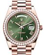 - Rolex Day-Date 40 President Rose Gold Olive Green Roman Dial Diamond Bezel 228345RBR Rolex Day-Date 40 President Rose Gold ... Roman Dial Diamond Bezel 228345RBRRetail Price: Regular Price $67,300 Save: $2,301 (3%) Our Price: Special Price $64,999