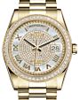 - Rolex Day-Date 36 Yellow Gold White Mother of Pearl Diamond Paved Roman Dial & Diamond Bezel President Bracelet 118348 Rolex Day-Date 36 Yellow Gold White ... Bezel President Bracelet 118348Retail Price: Regular Price $64,150 Save: $9,000 (14%) Our Price: Special Price $55,150