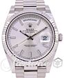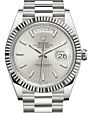 Made from gold or platinum and famously worn by President Dwight Eisenhower and other world leaders, the Rolex President Day-Date... line is established as a symbol of influence, power and status. Designed as a calendar watch, the original Day-Date I was the first watch of its type to display not only the date, but the day in full on the dial. Further technological improvements then followed with the release of the Day-Date 40, which perfectly blends design elements from its two predecessors, while embracing up-to-date aesthetics. Due to their iconic appearance and unique place in history, Rolex President Day-Date watches are among the most popular pre-owned and vintage watch models around. Read more Show less