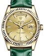 - Rolex Day-Date 36 Yellow Gold Champagne Index Dial & Fluted Bezel Green Leather Strap 118138 Rolex Day-Date 36 Yellow Gold Champagne ... Bezel Green Leather Strap 118138Retail Price: Regular Price $22,150 Save: $2,151 (10%) Our Price: Special Price $19,999