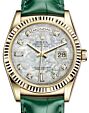 - Rolex Day-Date 36 Yellow Gold White Mother of Pearl Diamond Dial & Fluted Bezel Green Leather Strap 118138 Rolex Day-Date 36 Yellow Gold White ... Bezel Green Leather Strap 118138Retail Price: Regular Price $26,950 Save: $2,651 (10%) Our Price: Special Price $24,299