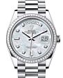 - Rolex Day-Date 36 President Platinum White Mother of Pearl Diamond Dial & Bezel 128396TBR Rolex Day-Date 36 President Platinum ... Diamond Dial & Bezel 128396TBRRetail Price: Regular Price $95,700 Save: $7,701 (8%) Our Price: Special Price $87,999